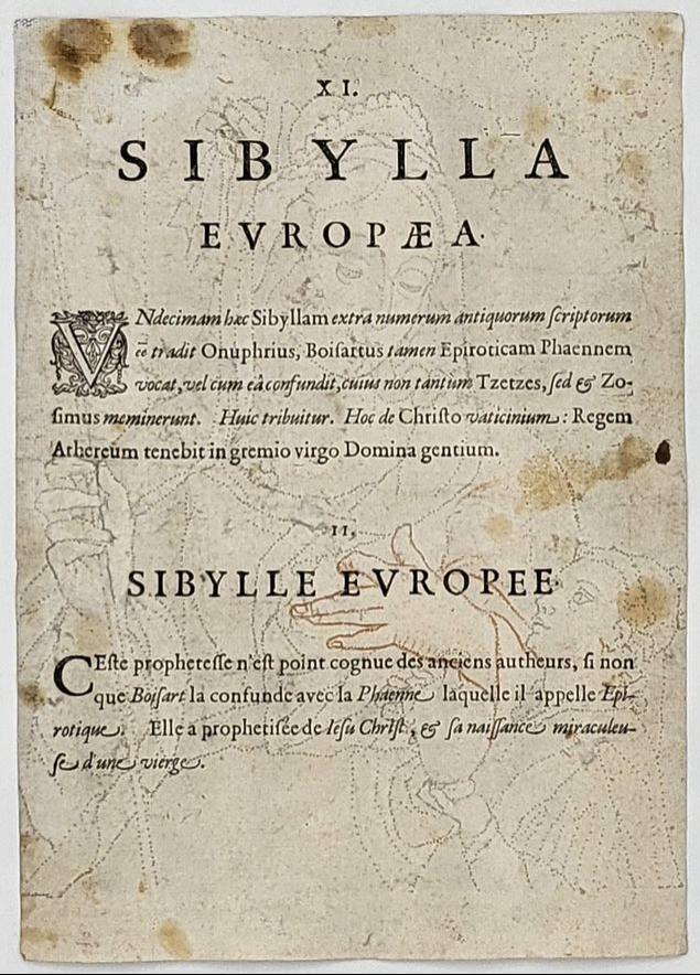 L'épreuve est coupée à la limite de la composition et fixée aux angles supérieurs sur une feuille de vélin ancien