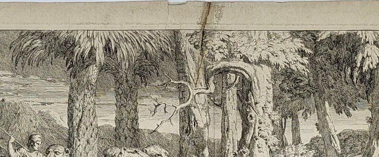 Conservation : l'estampe est vendue en l'état avec un pli médian marqué et une déchirure grossièrement comblée et salie dans la marge supérieure, et une autre dans la marge inférieure ; on note également des marques de manipulation et de très courtes déchirures dans les marges et un verso très empoussiéré, etc...
