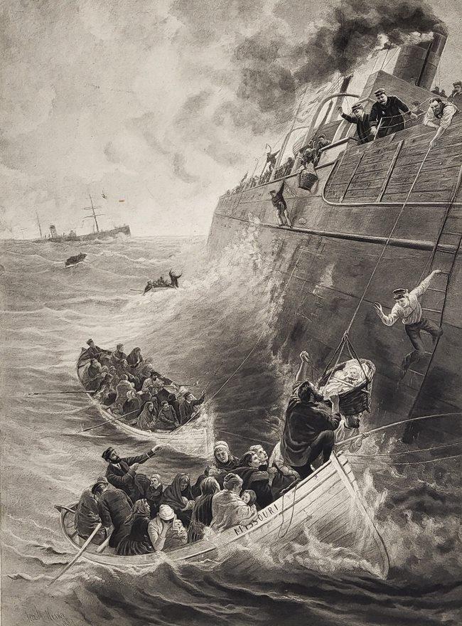 Sauvetage du S/S Danmark par le capitaine Murrell du vapeur anglo-américain Missouri. Avril 1889 (voir le lien Wikipédia, en anglais)