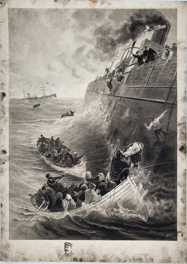Très rare épreuve d'atelier d'un tout premier tirage avant tout lettre, avec remarque figurant un petit portrait du capitaine Murrell, imprimée par Goupil et C° après le célèbre naufrage du Danmark qui assurait la ligne de la C° Thingvalla entre le Danemark et Philadelphie aux Etats-Unis.