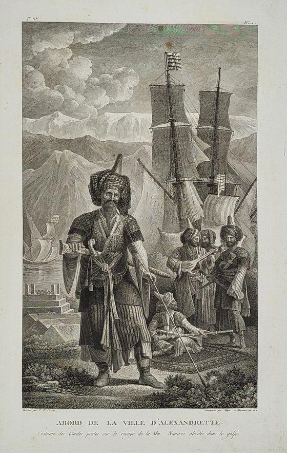 Abord vde la ville d'Alexandrette (costume des gardes postés dur le rivage de la Mer. Navires abrités dans le golfe)