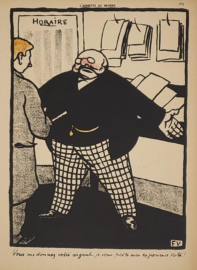 Lithographie en couleurs publiée dans le numéro spécial du 1er mars 1902 de "L'assiette au beurre", monogrammée FV dans la pierre