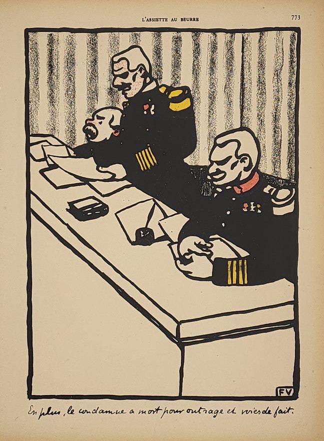 Lithographie en couleurs publiée dans le numéro spécial du 1er mars 1902 de "L'assiette au beurre", monogrammée FV dans la pierre