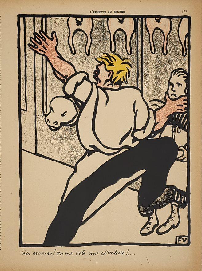 Lithographie en couleurs publiée dans le numéro spécial du 1er mars 1902 de "L'assiette au beurre", monogrammée FV dans la pierre