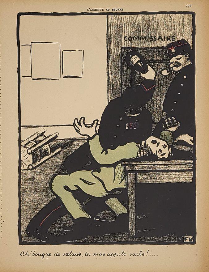 Lithographie en couleurs publiée dans le numéro spécial du 1er mars 1902 de "L'assiette au beurre", monogrammée FV dans la pierre