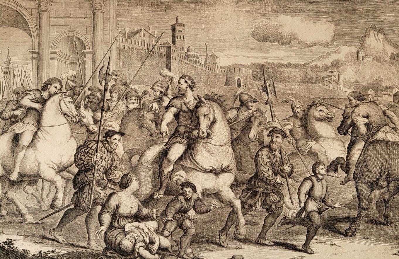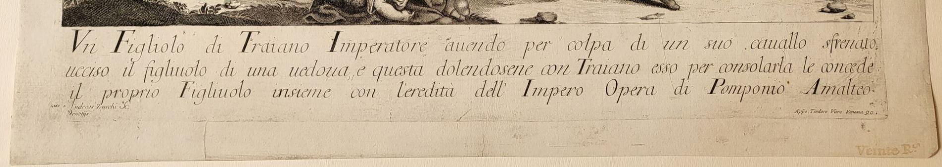 Cette estampe d'Andrea Zucchi reflète fidèlement le tableau récemment retrouvé de Pomponio Amalteo (1505 - 1588), le gendre du Pordenone, dont on ne connaissait jusqu'à présent que la fresque décorant la Loggia municipale de Vittorio Veneto (Vénétie). Il est fort probable que le tableau retrouvé soit préparatoire à la fresque et constitue une sorte de transition entre le dessin original du Pordenone et la fresque finale exécutée par Amalteo.