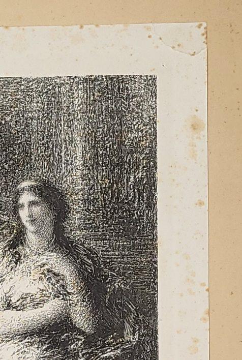Rousseurs dans les marges. L'épreuve est fixée aux angles supérieurs sur une cartonnette de couleur bis. Rupture de l'angle supérieur droit (voir visuel). Quelques marques dans les noirs et un pli cassé surtout visibles en lumière rasante