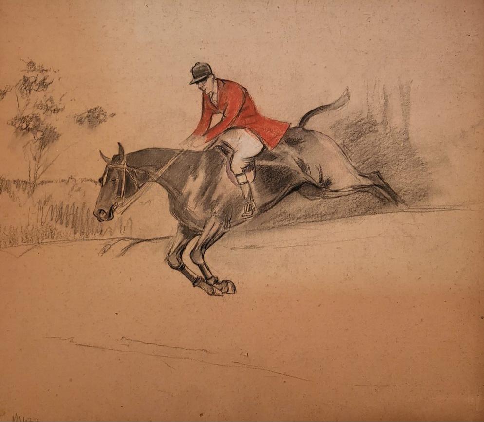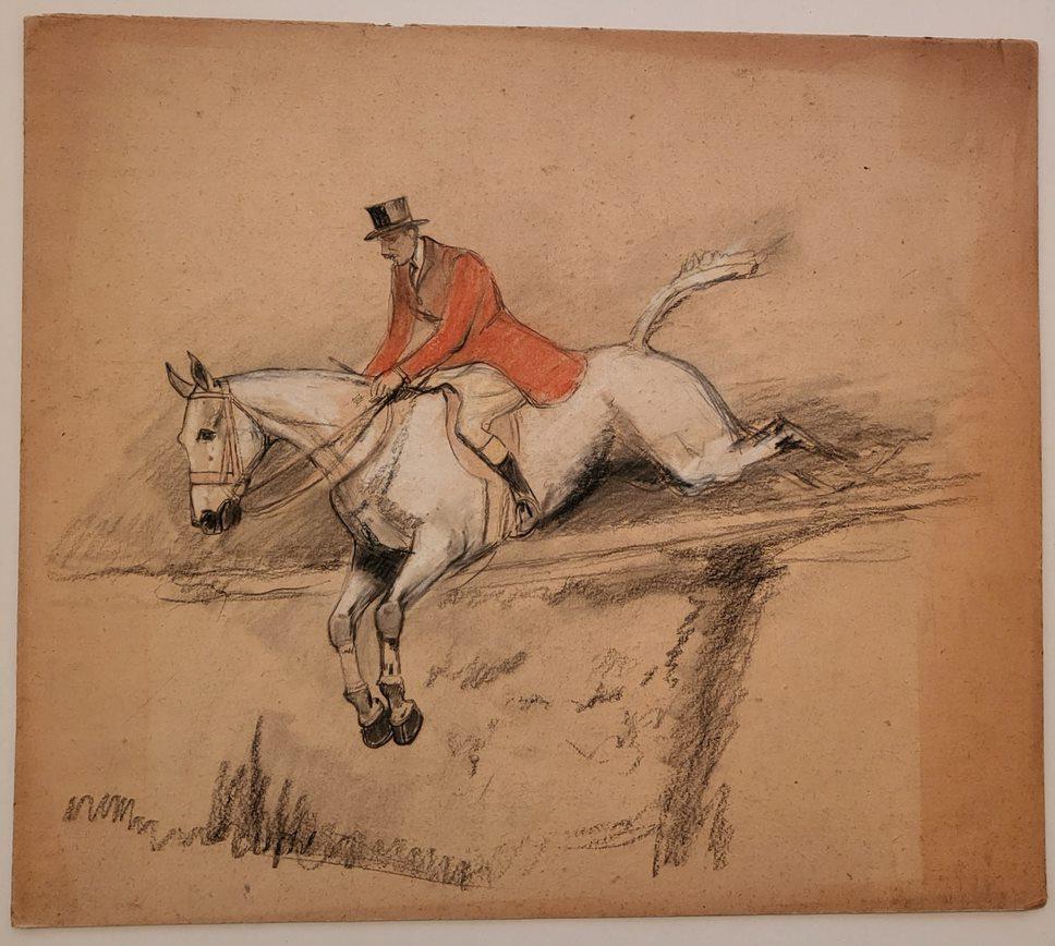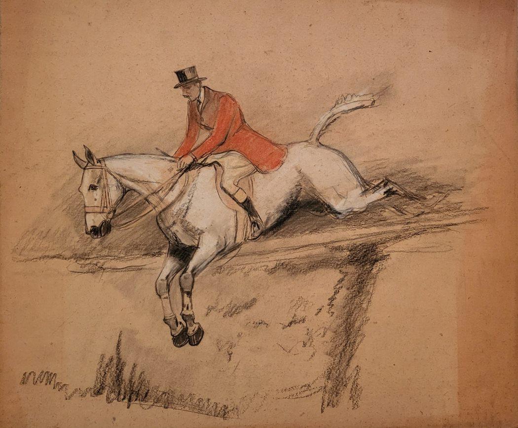 Etudes de cavalier sautant un obstacle. Dessin aux trois crayons avec rehauts de blanc, sur bristol
