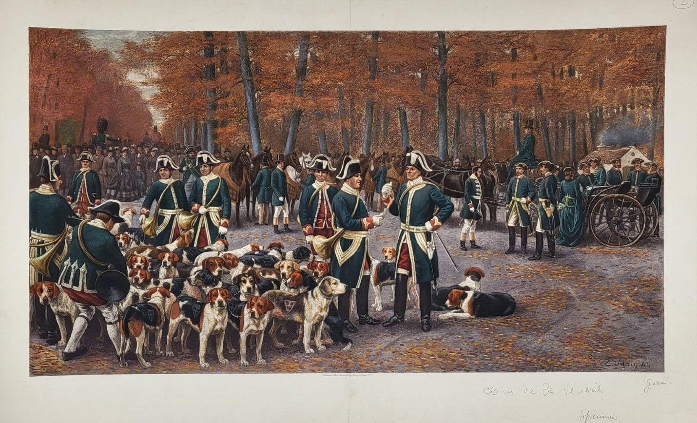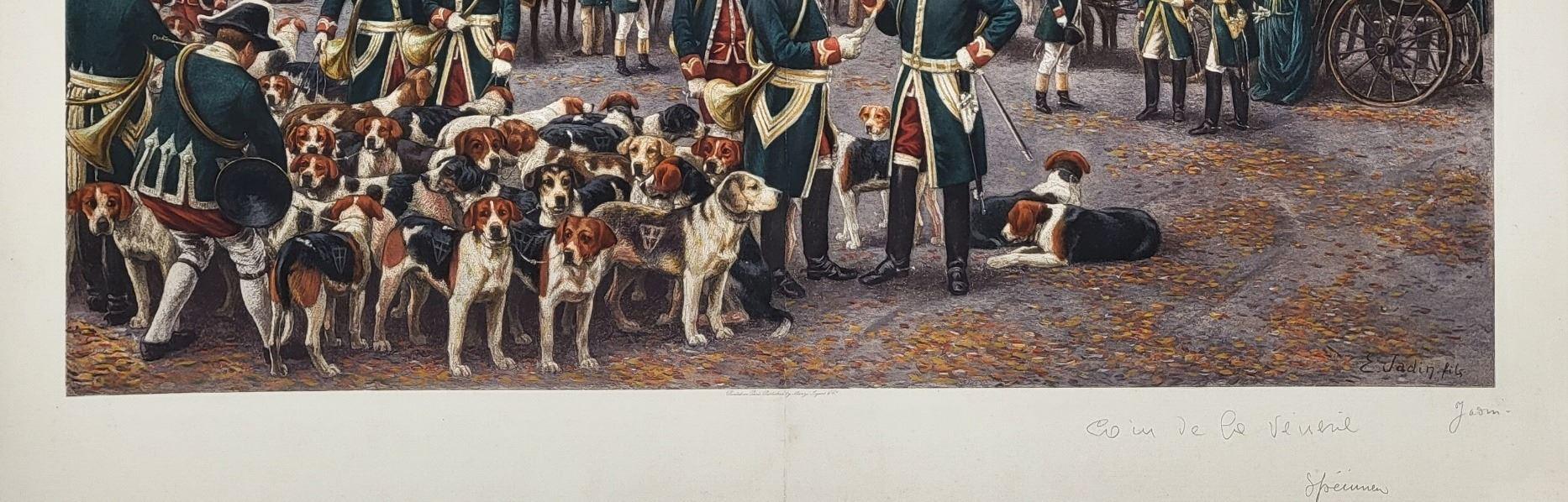 Ces estampes bénéficiant souvent d'un coloris exceptionnel étaient confiées aux représentants de la maison afin qu'ils puissent prendre des commandes auprès de la clientèle de revendeurs... Pour la commodité des voyageurs de commerce, les grands formats étaient pliés en deux et renforcés au pli vertical par une bande de tissus collé.