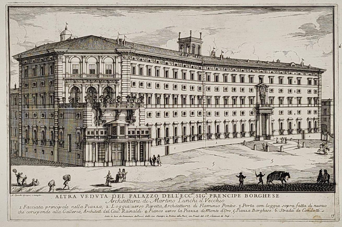 La construction du Palazzo Borghese a été commencée par Mgr Tommaso Del Giglio et poursuivie par le cardinal Pedro de Deza; En 1600, la façade sud a été achevée; De nombreux historiens de l’art attribuent la conception de cette section à Martino Longhi. En 1604, le cardinal Camillo Borghese acheta le bâtiment, qu’il légua aux membres de sa famille après son élection.