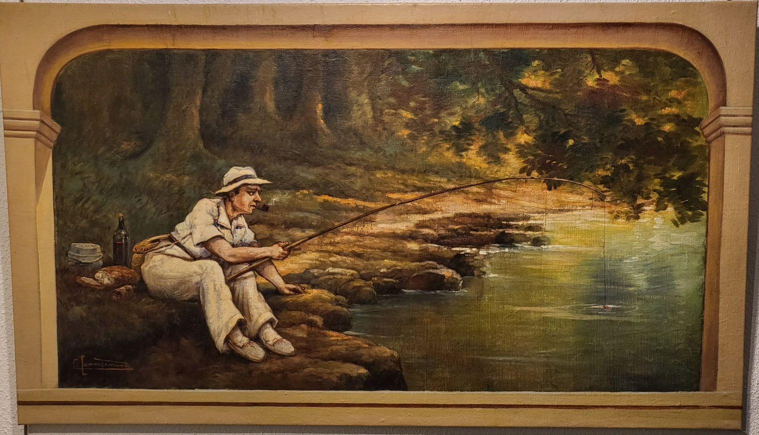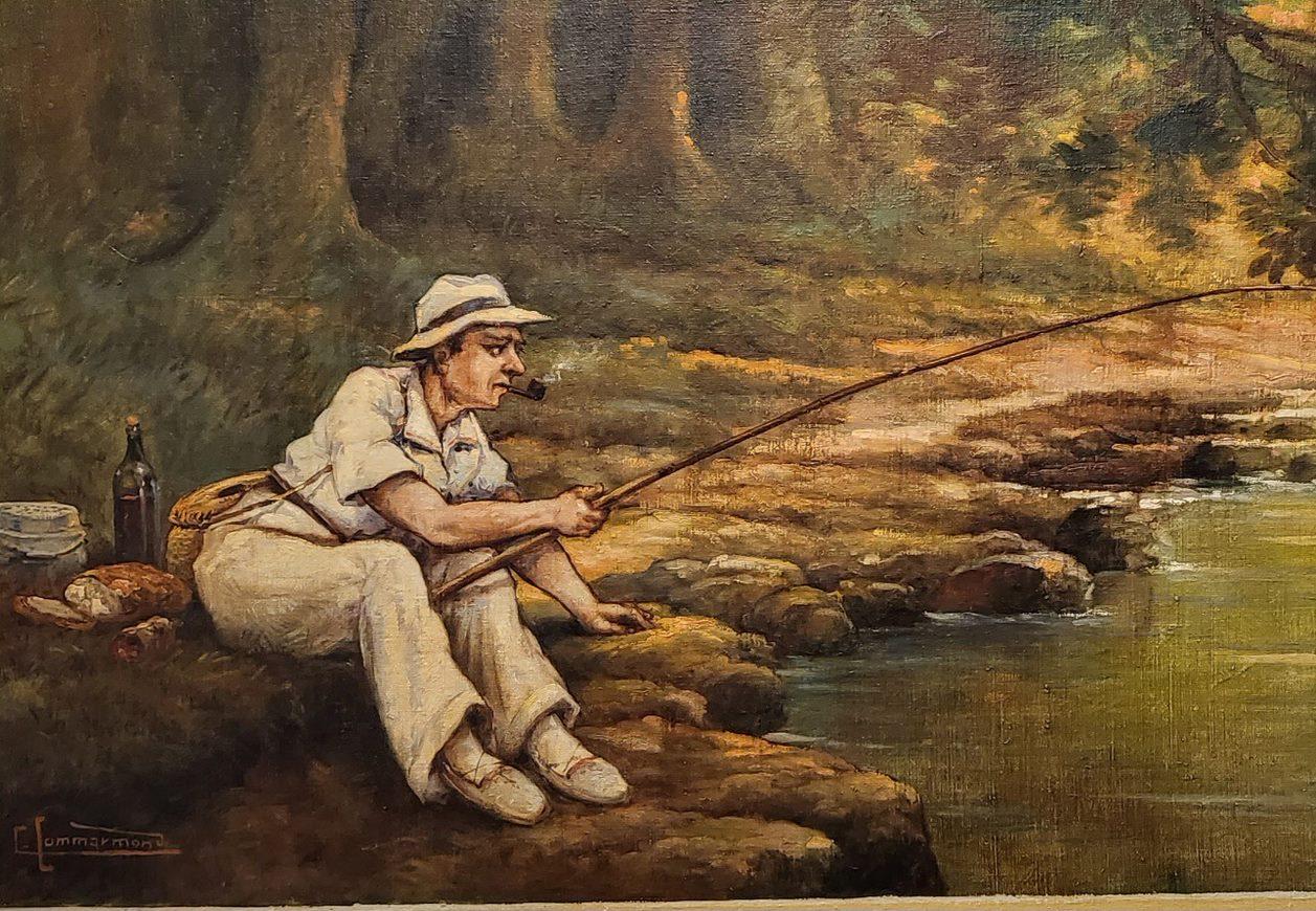 Pêcheur à la ligne au bord d'une berge de rivière ombragée