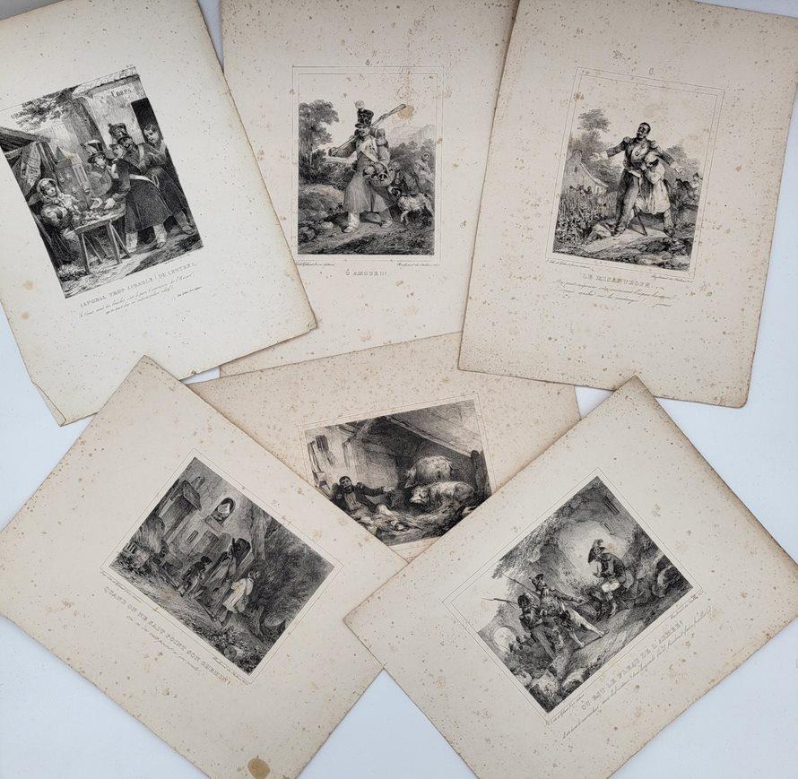 On joint 5 pl. aux marges réduites et 11 autres planches par Raffet, Grenier ou Bellangé (sujets galants, bataille révolutionnaire, les 3 Glorieuses, etc.)