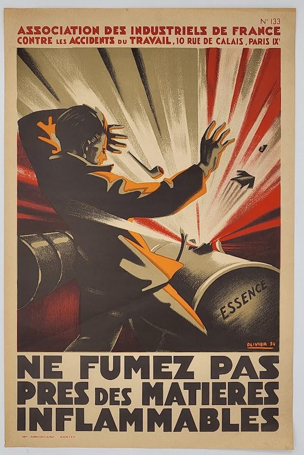 OLIVIER (Affichiste des années 1930)Ne fumez pas près des matières inflammables. 1934Affiche en couleurs58 x 38,5 cmEn feuille, en très bon état