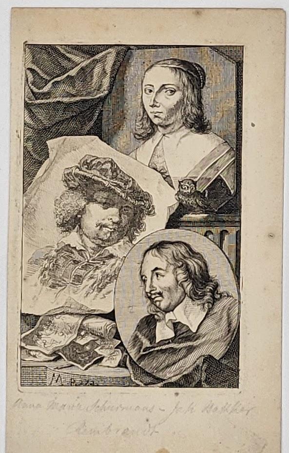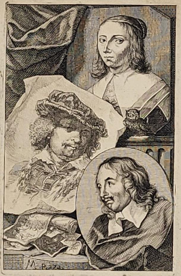 Rare planche extraite de Le Grand Théâtre des peintres et peintresses néerlandaises, de 1718, où sont représentés Anna Maria Schurmans, Jacob Adriaensz Backer et Rembrandt, (Page 272 de la Partie 1 du Schouburg d’Arnold Houbraken de 1718)