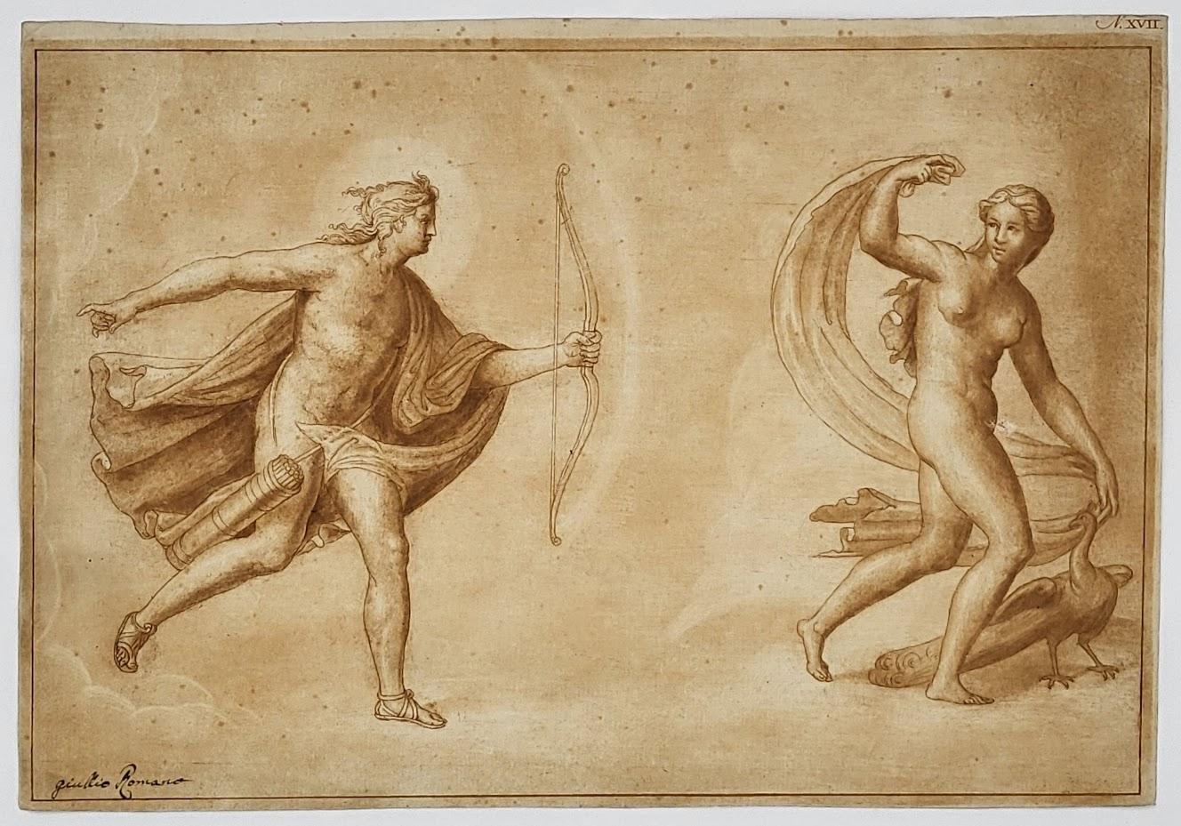 Gravure à la manière de sanguine. Bonne épreuve coupée à la limite de la composition, tirée sur vergé filigrané, annotée à la plume "Giulio Romano" dans l'angle inférieur gauche