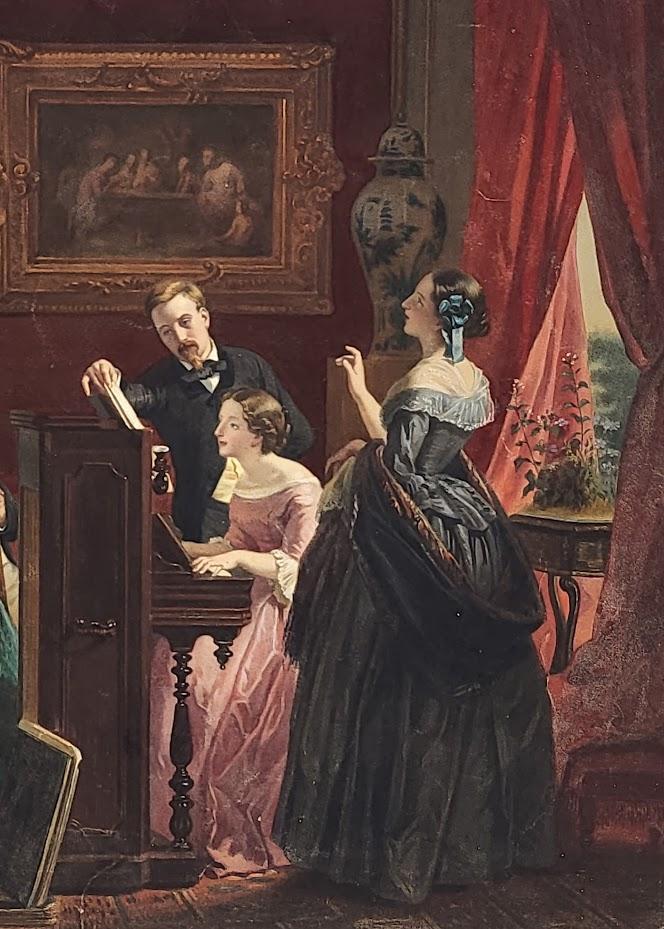La cantatrice debout, près du piano représente Henriette Sontag (Henriette Gertrude Walpurgis Sontag, comtesse de Lauenstein née à Coblence en 1805 et morte du choléra à Mexico en 1854). Nous n'avons pas trouvé trace de la peinture de Hillmacher et ne savons pas si son titre était en rapport avec le nom de la célèbre cantatrice. Il est possible que la Maison Goupil ait préféré un titre plus passe partout comme "Concert de famille". La même lithographie a été reprise par un éditeur allemand sans les noms de Hillemacher ni celui de Thielley, simplement intitulée : GESANG / Henriette Sontag. Un exemplaire de cette estampe est conservée à la bibliothèque de Vienne (lien vers cet exemplaire).