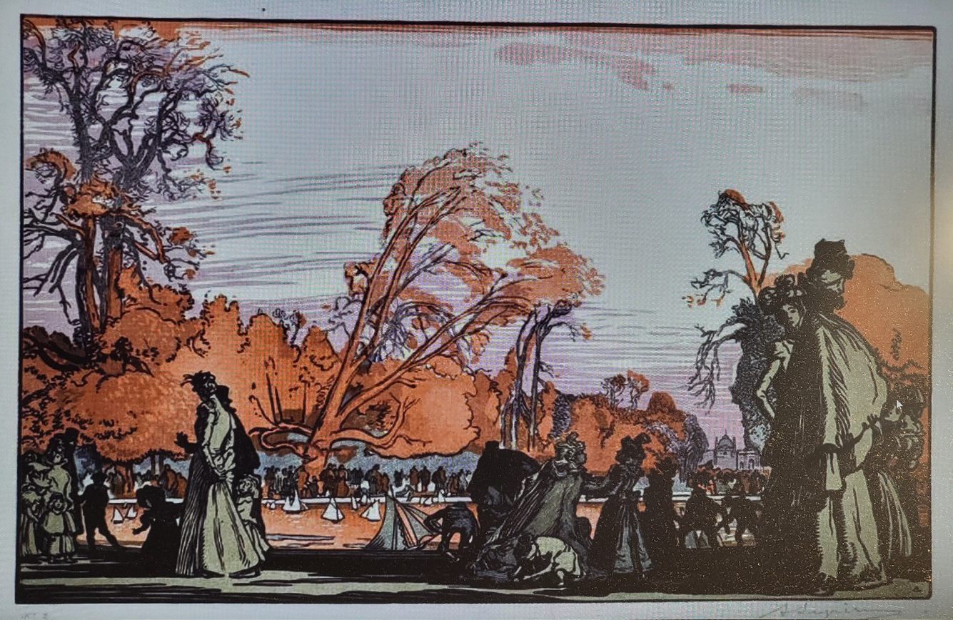 Gravure sur bois imprimée en noir, jaune, orange et rouge.