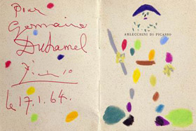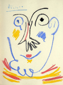 Pablo Picasso (1881-1973) - Arlequin, 1964. Dessin aux crayons de couleurs, signé et dédicacé à Germaine Duhamel, 12 x 17 cm [...] Provenance: Germaine Duhamel, puis Sébastien Thevenin - Anaf Arts Auction / Lyon - Expert : Alain Cano - Adj. : 25 000 €