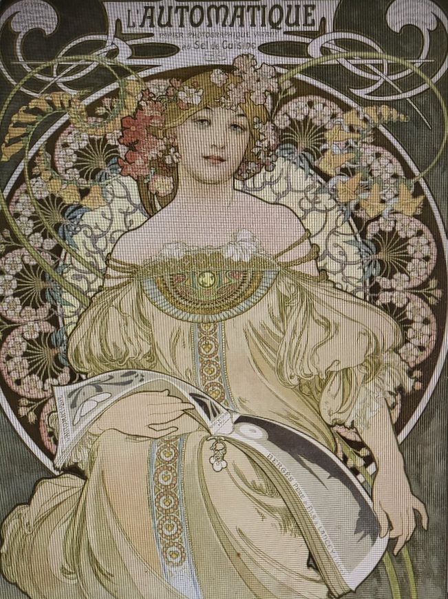 Lithographie en couleurs imprimée par Champenois. Variant 7 de Rêverie, « une des oeuvres les plus belles et les plus souvent ré-imprimées de Mucha »