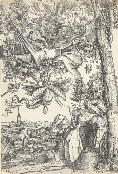 Le rêve du Docteur. Circa 1498/1499. Burin. Superbe épreuve contrastée d'un tirage du temps (Meder b ?), sur papier vergé filigrané coupé au-delà du filet d'encadrement. Filigrane : "Tête de bœuf " proche de Meder 62. Bibliographie : Bartsch 76, Hollstein 70, Meder 70. Dimensions hors tout, avec le filet de marge du cuivre : 19 x 12 cm.